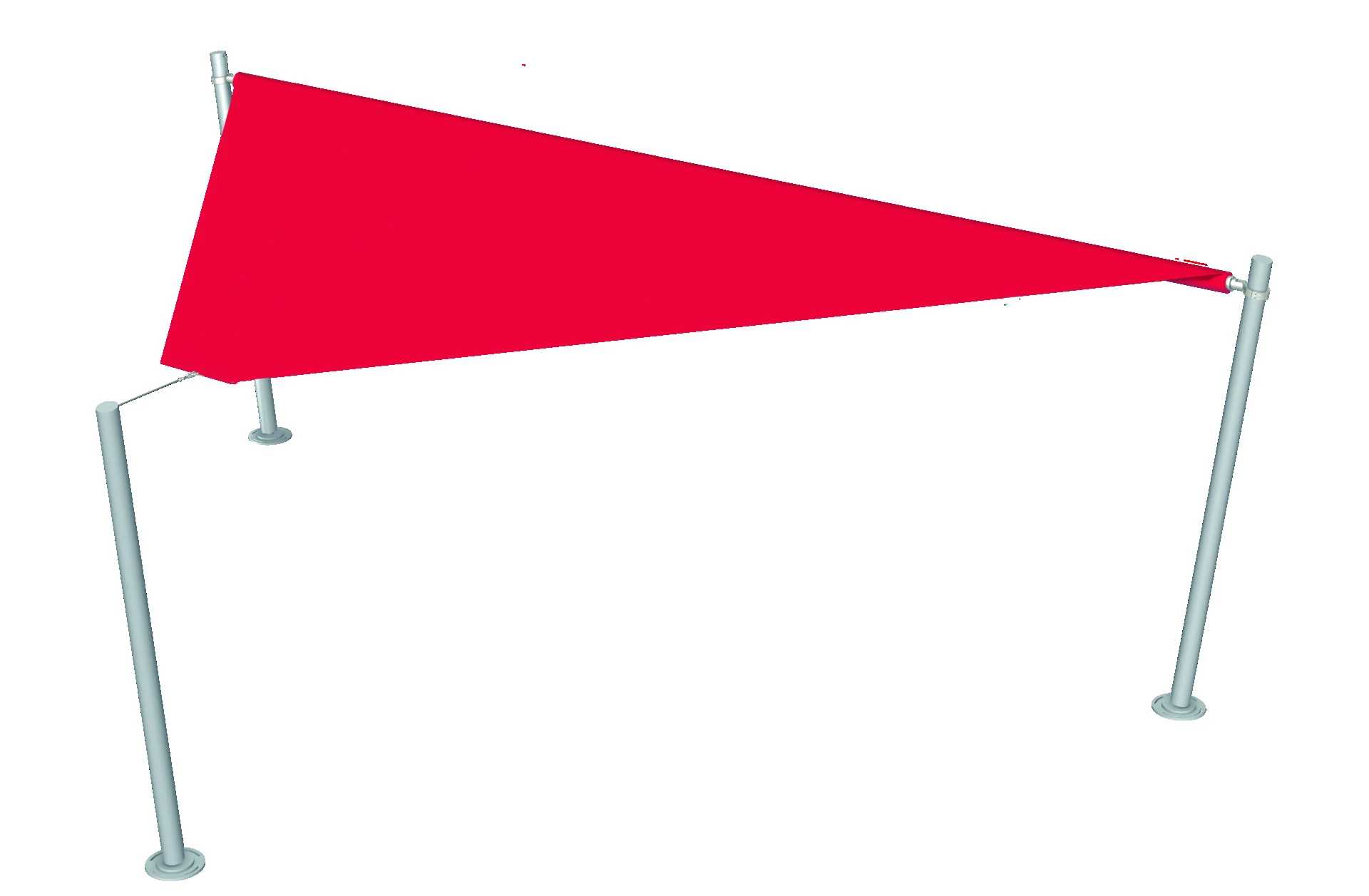 Rotes Sonnensegel dreieckig gespannt auf silbernen Stangen